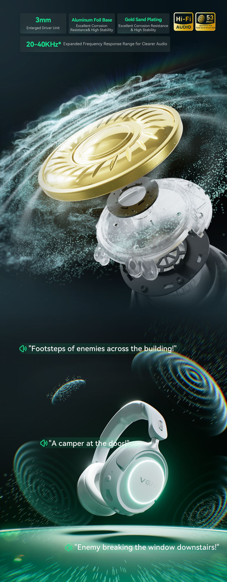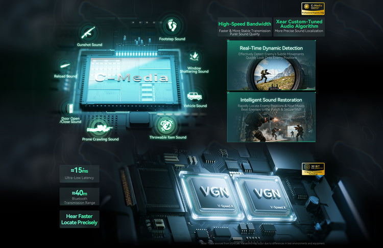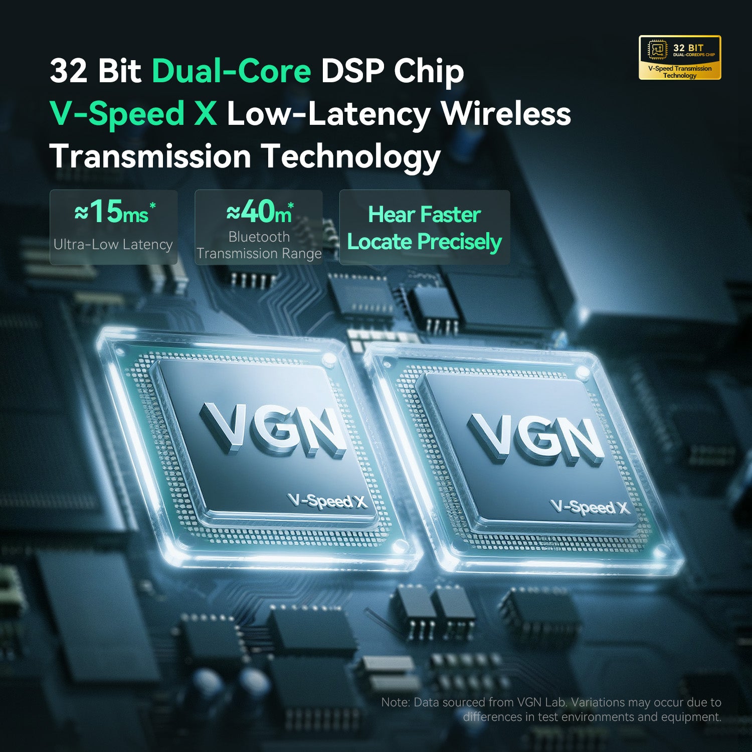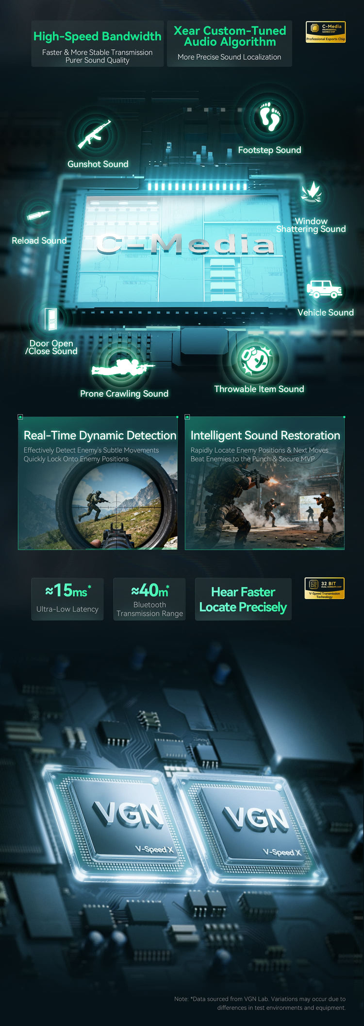 Benutzerdefinierter FPS-Audioalgorithmus erhöht die Positionsorientierung durch dynamische Verstärkung, maximiert die Chip-Leistung zur Isolierung von Schritten und Fähigkeitsgeräuschen. V-SpeedX Low-Latency Wireless, kombiniert mit Dual-Core-DSP und VGNs proprietärer Technologie, bietet keine Verzögerung und keine Audio-Video-Synchronisationsprobleme.