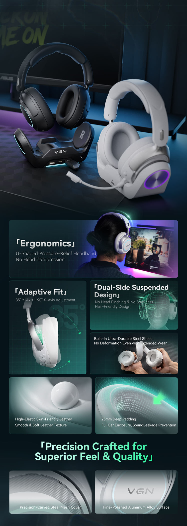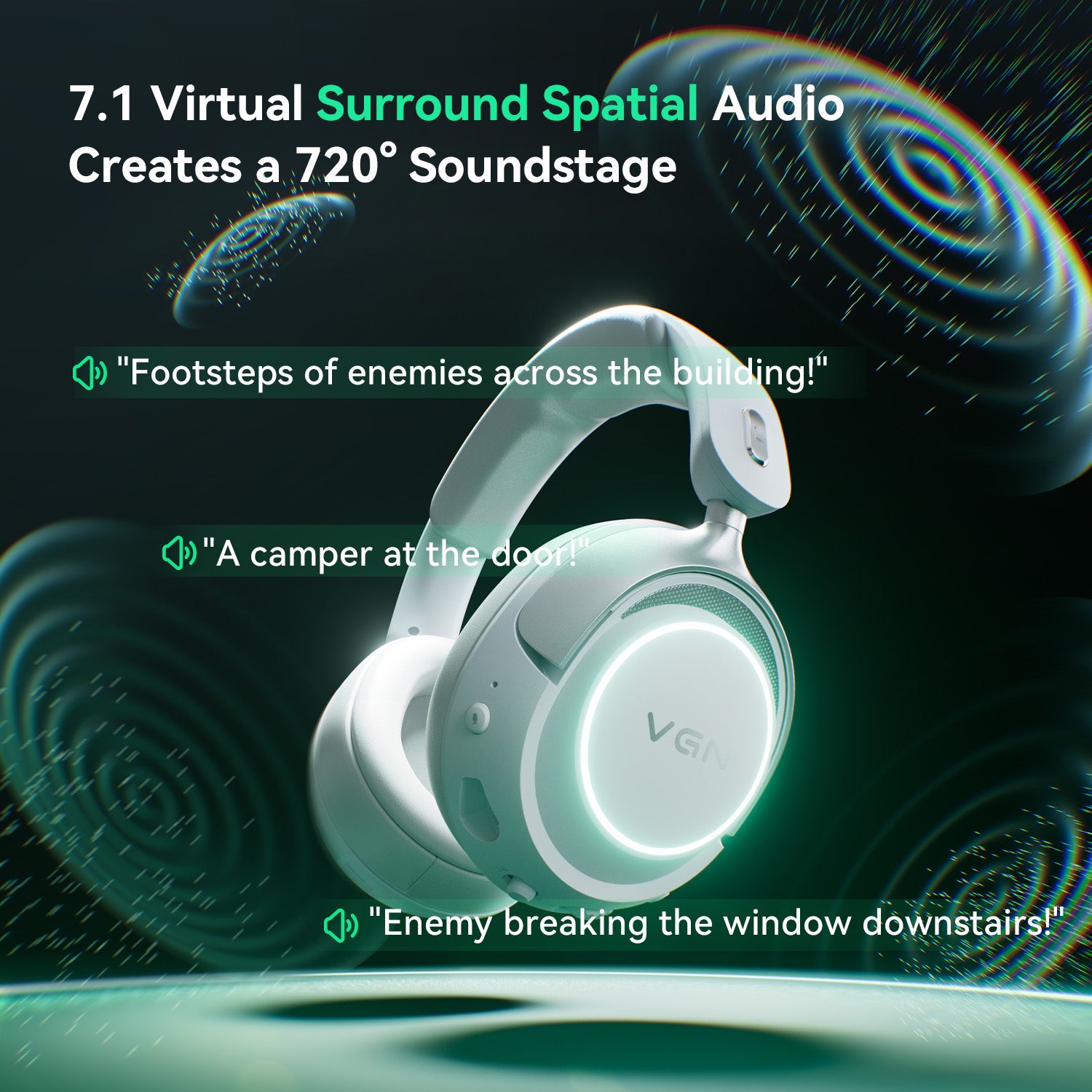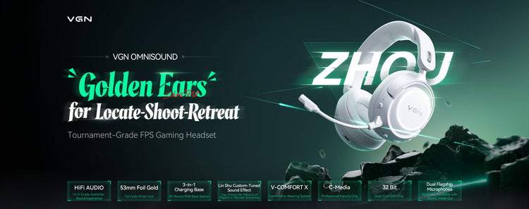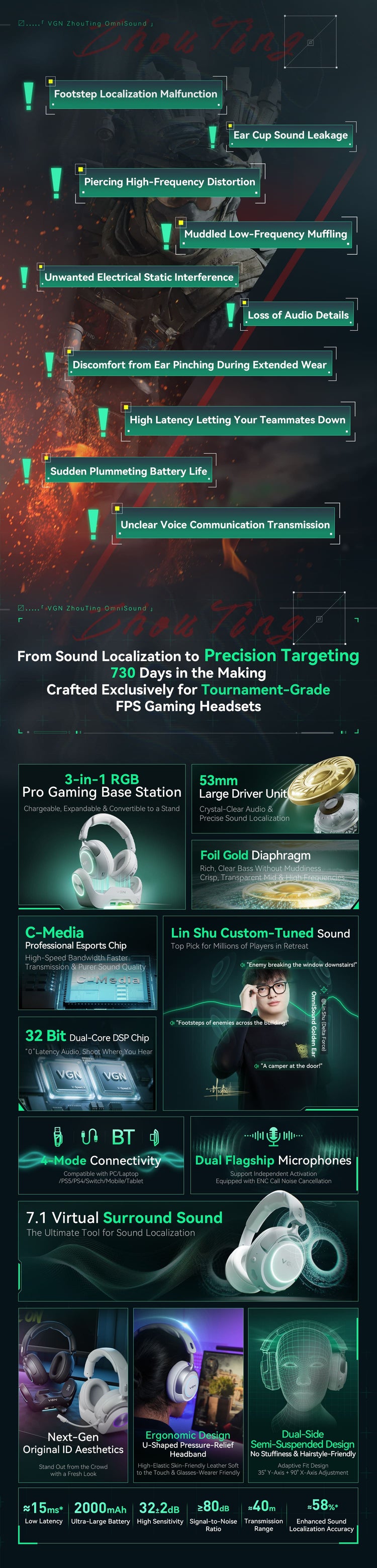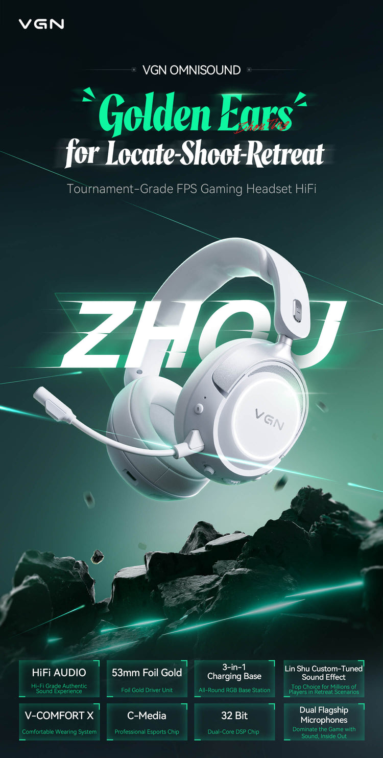Benutzerdefinierter FPS-Audioalgorithmus erhöht die Positionsorientierung durch dynamische Verstärkung, maximiert die Chip-Leistung zur Isolierung von Schritten und Fähigkeitsgeräuschen. V-SpeedX Low-Latency Wireless, kombiniert mit Dual-Core-DSP und VGNs proprietärer Technologie, bietet keine Verzögerung und keine Audio-Video-Synchronisationsprobleme.