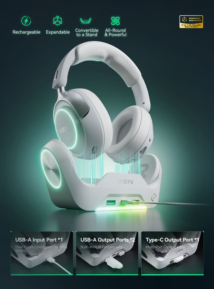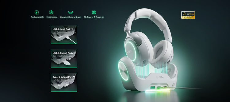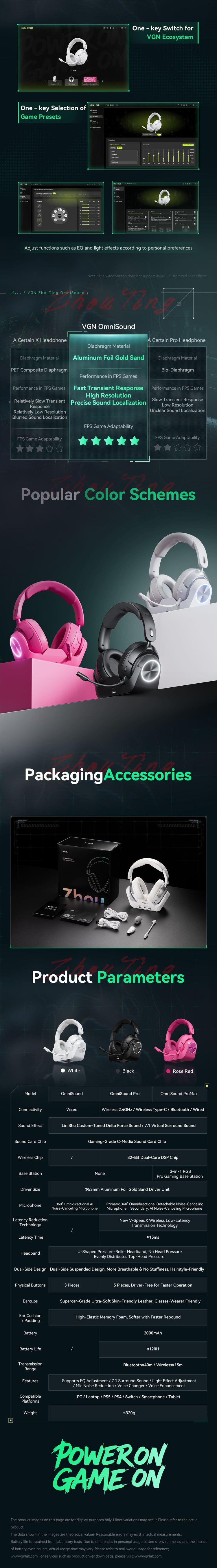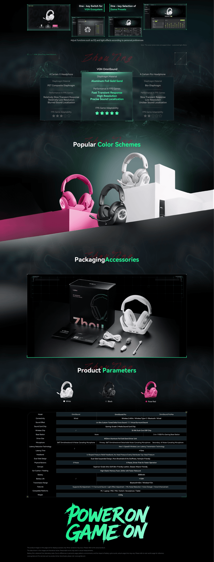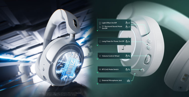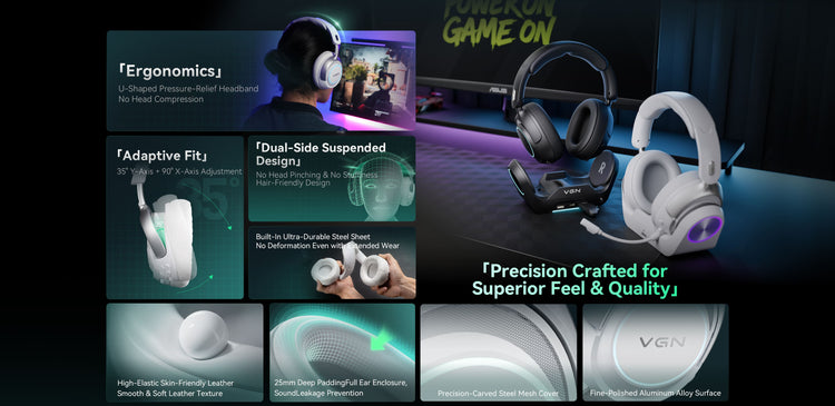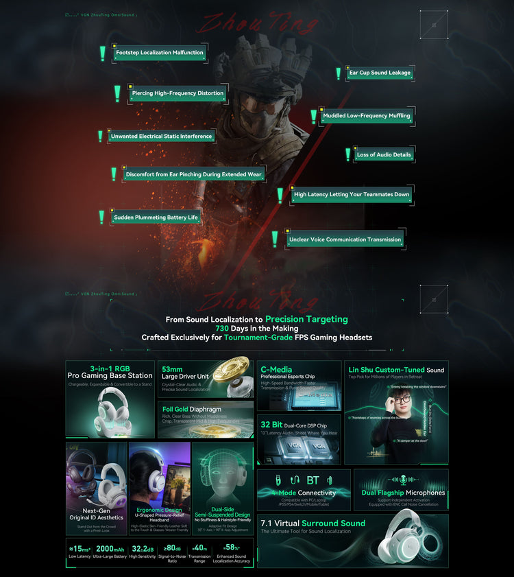 Benutzerdefinierter FPS-Audioalgorithmus erhöht die Positionsorientierung durch dynamische Verstärkung, maximiert die Chip-Leistung zur Isolierung von Schritten und Fähigkeitsgeräuschen. V-SpeedX Low-Latency Wireless, kombiniert mit Dual-Core-DSP und VGNs proprietärer Technologie, bietet keine Verzögerung und keine Audio-Video-Synchronisationsprobleme.