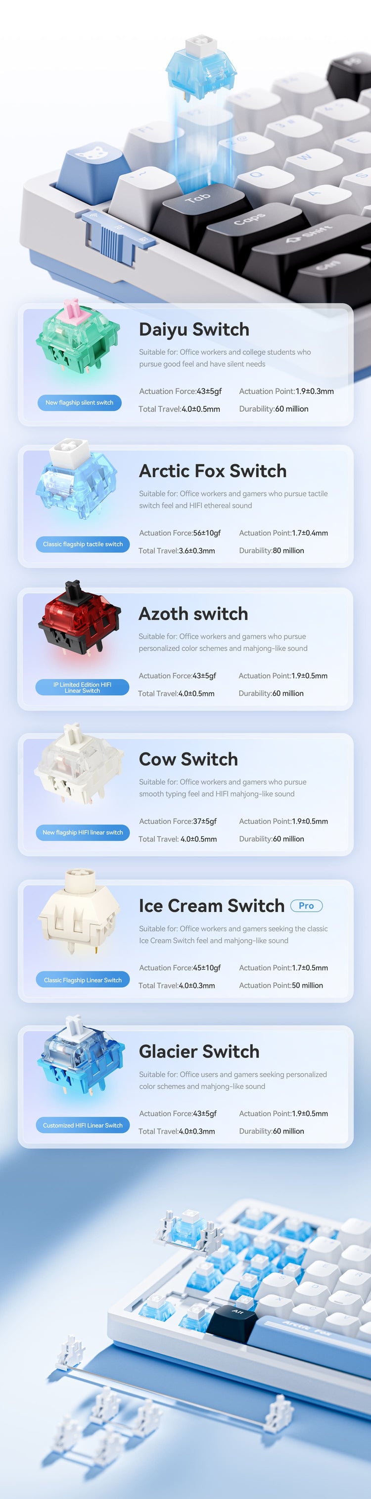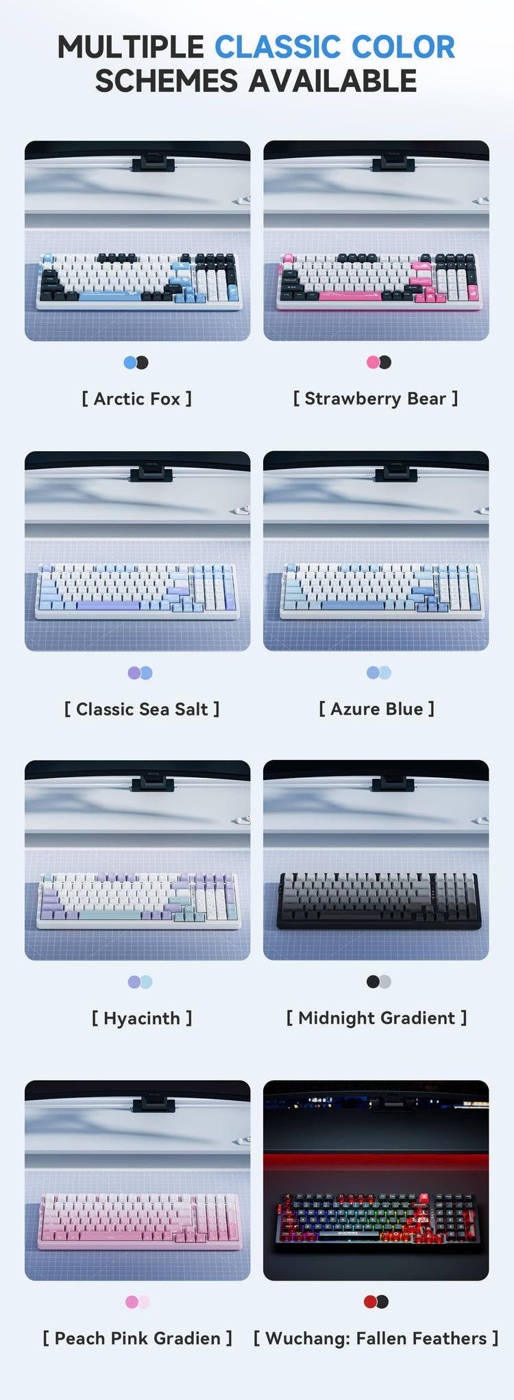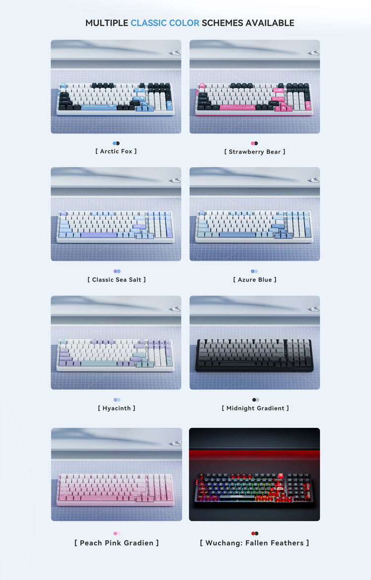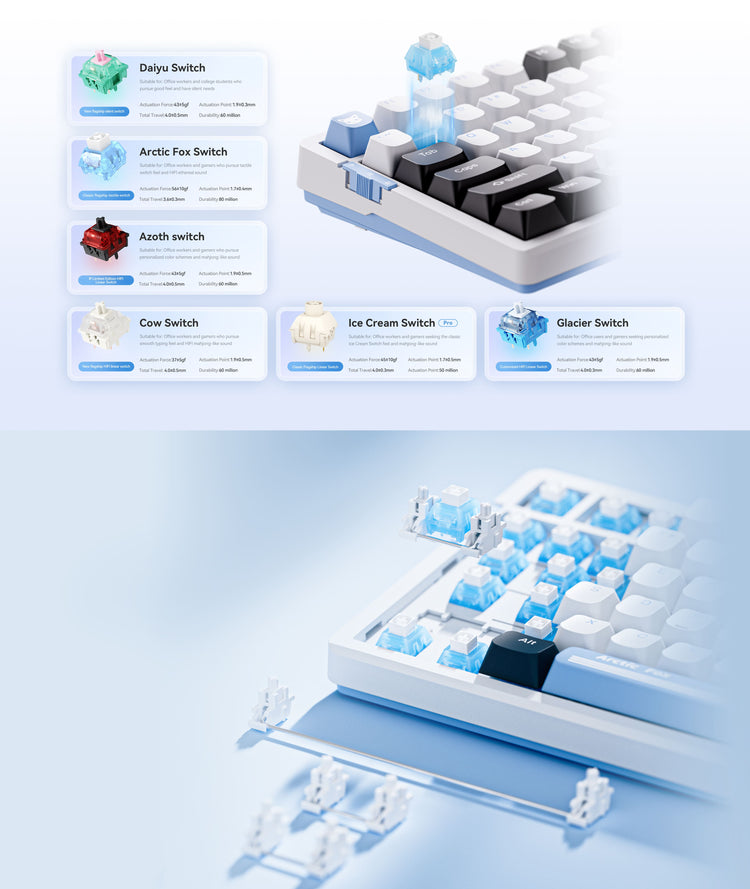 Continuing classic switches, the new flagship launches hotly—full-keyboard hot-swappable for easy customization, with factory-calibrated custom stabilizers for crisper keystrokes and focused sound.